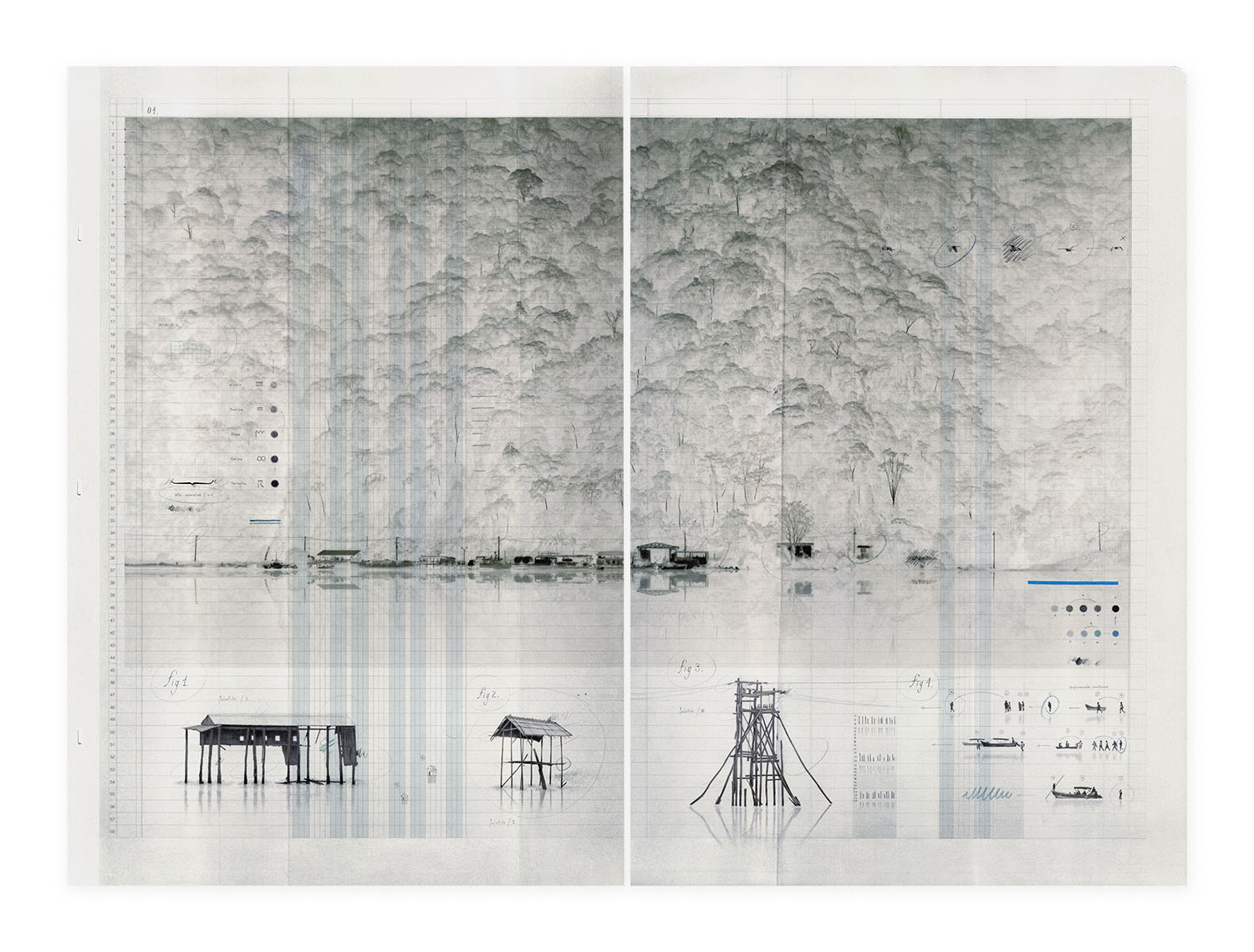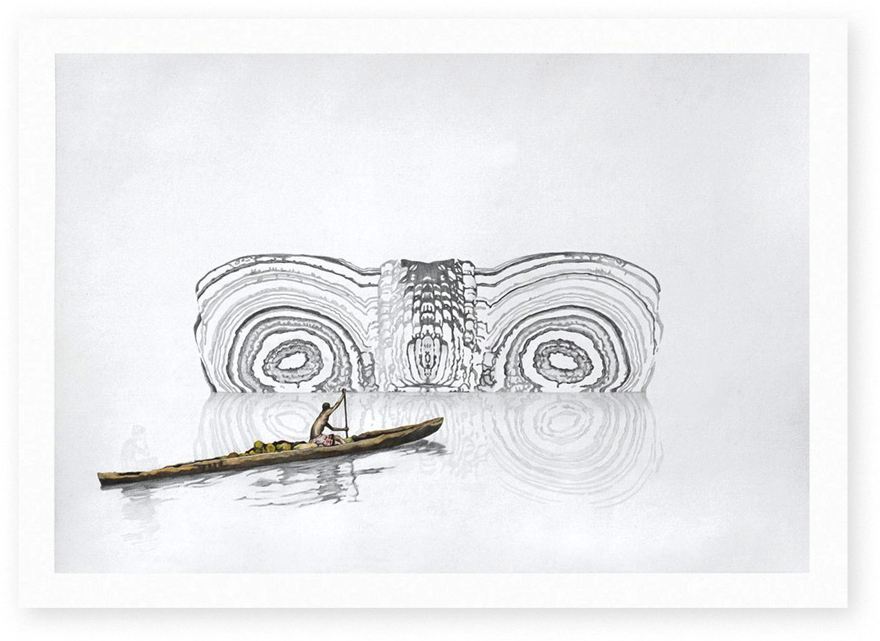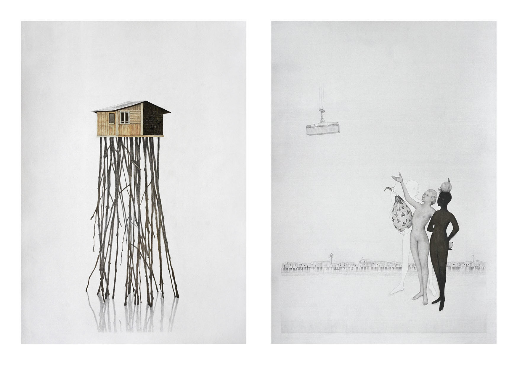 “Inflexión Palafítica”, vincula al individuo con su entorno. Es grafito sobre papel y algunas intervenciones de acuarela, las que construyen la morfología de un proyecto en el que el palafito constituye la anatomía de su forma. En su confección se describe cómo la construcción de la persona, interviene en la cimentación de la urbe que habita. Ahí, la presencia patente de los vicios de la sociedad delatan un panorama de profunda división que deja al descubierto el tabú hostigante y avasallador de la ceguera medial y popular. El proyecto de Felipe Bedoya exhibe lo desconocido, lo que no se ve a simple vista. Los matices y virtudes de una